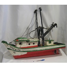 ARTESANATO REPRESENTANDO UM BARCO PESQUEIRO (65X82X29 CM), CONFECCIONADO EM MADEIRA. PINTADO NAS CORES BRANCO, VERDE E VERMELHO. POSSUI DIVERSAS FIAÇÕES ELÉTRICAS, E PARTE DELE ESTÁ DESMONTANDO.