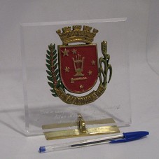 BRASÃO (11X9 CM) DA CIDADE DE MARINGÁ - PR, FIXADA EM UMA PLACA DE VIDRO (15X15CM) COM A INSCRIÇÃO 'COM OS CUMPRIMENTOS DO PREFEITO MUNICIPAL / SILVIO MAGALHÃES BARROS II. / MARINGÁ - PARANÁ - BRASIL'. ENCAIXADO EM UMA BASE DE METAL DOURADO. ACONDICIONADO EM CAIXA DE PAPELÃO COM UMA FITA VERDE E AMARELA NA TAMPA.
