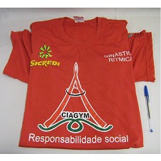 DUAS CAMISETAS (TAM G) E UMA CAMISETA (TAM GG) NA COR VERMELHA. NA FRENTE POSSUI AS INSCRIÇÕES 'GINÁSTICA RÍTMICA' E RESPONSABILIDADE SOCIAL E AS MARCAS SICREDI E CIAGYM. NA MANGA ESQUERDA O BRASÃO DA PREFEITURA DO MUNICÍPIO DE MARINGÁ E ATRÁS 'CIAGYM / MARINGÁ'.