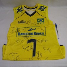 CAMISETA DA SELEÇÃO BRASILEIRA FEMININA DE VOLEIBOL (TAM M) AUTOGRAFADA PELAS JOGADORAS. NA FRENTE A MARCA DOS PATROCINADORES, A BANDEIRA NACIONAL E O NÚMERO 7. ATRÁS O NÚMERO 7 E O NOME DA JOGADORA MARI.