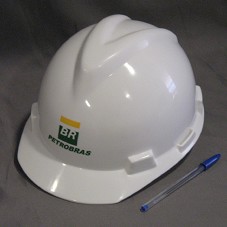 CAPACETE DE PROTEÇÃO, MODELO UTILIZADO NA CONSTRUÇÃO CIVIL, NA COR BRANCA, COM NOME E LOGOMARCA DA 'PETROBRAS', NA PARTE FRONTAL.