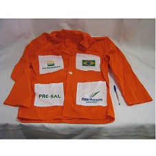 UNIFORME / JALECO EM TECIDO LARANJA, DE MANGA COMPRIDA. NA FRENTE, QUATRO BOLSOS. EM CADA UM, BORDADO COM NOME E LOGOMARCA DA 'PETROBRAS', 'BM F BOVESPA', 'BANDEIRA DO BRASIL' E 'PRÉ-SAL', ATRÁS, 'PRESIDENTE LULA / PETR3 PETR4 / PRÉ-SAL / MAIOR CAPITALIZAÇÃO DO MUNDO / 24/9/2010'.