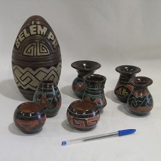 CONJUNTO DE SETE MINI VASOS CERÂMICOS E UM POTE (18 CM) NO FORMATO DE UM OVO, COM TAMPA. NESTE ÚLTIMO, A INSCRIÇÃO 'BELÉM PA'. OS VASOS POSSUEM TONALIDADE ESCURA, COM DESENHOS ESTILO MARAJOARA, NAS CORES VERDE, AMARELO E MARROM CLARO, E FORMATOS DIVERSOS. ACONDICIONADO EM CAIXA DE PAPELÃO FLORIDA, COM TAMPA VERMELHA.
