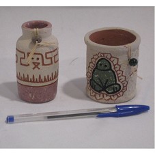 DOIS MINI VASOS CERÂMICOS. O PRIMEIRO (8X4X4 CM) COM BOCA MAIS ESTREITA QUE O BOJO, POSSUI BASE PINTADA EM TONS ROSADO, E O RESTO EM TOM BEGE, COM DESENHOS GRAVADOS. NA BOCA, UMA SEMENTE PRESA COM FITA DE PALHA. O SEGUNDO (6,5X6X6 CM) DE FORMATO CILÍNDRICO, EM TOM BEGE, COM DESENHO DE UM BICHO VERDE (UM SAPO, TALVEZ). ACOMPANHA CARTÃO DE VISITA DO AGENTE.