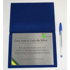 PLACA (13X16 CM) EM METAL PRATEADO, CONTENDO A INSCRIÇÃO 'AO EXCELENTÍSSIMO SENHOR LUIZ INÁCIO LULA DA SILVA / PRESIDENTE DA REPÚBLICA FEDERATIVA DO BRASIL / EM AGRADECIMENTO PELA LUTA EM FAVOR D EUMA EDUCAÇÃO TÉCNICA E TECNOLÓGICA DE QUALIDADE NO BRASIL / TERESINA (PI), 14 DE OUTUBRO DE 2010'. FIXADA EM ESTOJO, TIPO PASTA ABERTA, COBERTO DE VELUDO AZUL. POSSUI LOGOMARCA DO 'IF / INSTITUTO FEDERAL PIAUÍ'.