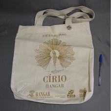 SACOLA (35,5X36 CM) CONFECCIONADA EM ALGODÃO CRU, COM ALÇA CURTA. NA FRENTE, ESTAMPA EM DOURADO, CONTENDO IMAGEM DE NOSSA SENHORA DE NAZARÉ, E A INSCRIÇÃO 'A FÉ E O SEU POVO / CÍRIO HANGAR / HANGAR CENTRO DE CONVENÇÕES E FEIRAS DA AMAZÔNIA / SECRETARIA DO ESTADO DE CULTURA / PARÁ GOVERNO POPULAR / CÍRIO 09 PATROCINADOR OFICIAL'.