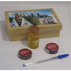 FRASCO (7 CM) CONTENDO DESODORANTE COLÔNIA (30 ML) 'ÁGUA DE CHAMMA'. ACOMPANHA DOIS MINISABONETES DE AÇAÍ. ACONDICIONADOS EM ESTOJO DE MADEIRA (5,2X17X11 CM), TENDO NA TAMPA DESENHO DE NOSSA SENHORA DE NAZARÉ, COM DIVERSAS IGREJAS AO FUNDO, MOSTRANDO A PROCISSÃO DO CÍRIO DE NAZARÉ.