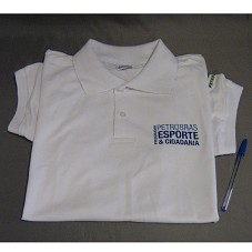CAMISA PÓLO (TAM G) EM TECIDO BRANCO, DE MANGA CURTA. NA FRENTE, A INSCRIÇÃO 'PROGRAMA PETROBRAS ESPORTE E CIDADANIA'. NAS MANGAS, LOGOMARCA DA EMPRESA E DA 'LEI DE INCENTIVO AO ESPORTE'.