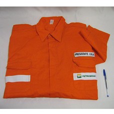 UNIFORME / CAMISA (TAM 62) DA PETROBRÁS, EM TECIDO LARANJA, DE MANGA COMPRIDA. POSSUI LOGOMARCA DA EMPRESA, E O NOME 'PRESIDENTE LULA' BORDADO PRÓXIMO AO BOLSO.