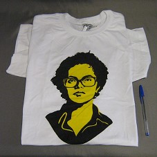 CAMISETA (TAM GG) EM MALHA BRANCA, DE MANGA CURTA. NA FRENTE, ESTAMPA COM FOTOGRAFIA EM NEGATIVO, NAS CORES PRETO E AMARELO, MOSTRANDO O ROSTO DE DILMA ROUSSEFF, E A INSCRIÇÃO 'DILMA NELES'.