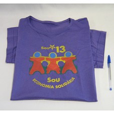 CAMISETA (TAM G) EM MALHA VIOLETA, DE MANGA CURTA. NA FRENTE, ESTAMPA COM A INSCRIÇÃO 'SOU PT 13 / SOU ECONOMIA SOLIDÁRIA', E DESENHO ESTILIZADO DE TRÊS PESSOAS JUNTAS.