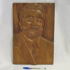 GRAVURA ENTALHADA EM MADEIRA (40X27 CM)) , RETRATANDO O PRESIDENTE LUIZ INÁCIO LULA DA SILVA DE TERNO E GRAVATA. NO CANTO SUPERIOR DIREITO A INSCRIÇÃO 'H.D.'. ATRÁS '2009 / FRANCISCO WELLINGTON HANS DONNER DE CARVALHO / THE - PI - 86-99 272767'.