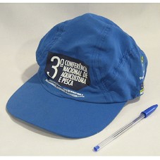 BONÉ EM TACTEL AZUL. NA FRENTE, ESTAMPA CONTENDO A INSCRIÇÃO '3ª CONFERÊNCIA NACIONAL DE AQUICULTURA E PESCA / CONSOLIDAÇÃO DE UMA POLÍTICA DE ESTADO PARA O DESENVOLVIMENTO SUSTENTÁVEL DA AQUICULTURA E PESCA.'. EM UMA DAS LATERAIS, LOGOMARCA DO GOVERNO FEDERAL E NOME DO 'MINISTÉRIO DA PESCA E AQUICULTURA'.