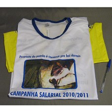 CAMISETA (TAM G) EM MALHA BRANCA, COM MANGAS CURTAS E AMARELAS. NA FRENTE, ESTAMPA COM FOTOGRAFIA DE UM BOI DORMINDO E A INSCRIÇÃO 'PROPOSTA DE PATRÃO É CONVERSA PRA BOI DORMIR. CAMPANHA SALARIAL 2010/2011'. ATRÁS, 'WWW.SIMECAT.ORG.BR / REAJUSTE SALARIAL / REDUÇÃO DE JORNADA / COMBATE A DEMISSÃO IMOTIVADA / LICENÇA MATERNIDADE DE 180 DIAS / AUMENTO VALE ALIMENTAÇÃO'.