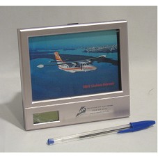 PORTA-RETRATO (13X14,5 CM) DE MESA, CONFECCIONADO EM PLÁSTICO PRATEADO, COM FUNDO PRETO. POSSUI FOTOGRAFIA DE UM AVIÃO E A INSCRIÇÃO 'NHT LINHAS AÉREAS / QUEM VOA TEM MAIS TEMPO'. POSSUI RELÓGIO DIGITAL. ACONDICIONADO EM CINTA DE PAPEL CRAFT, COM CALENDÁRIO DO ANO DE 2011.