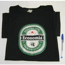 CAMISETA (TAM M) EM MALHA PRETA, DE MANGA CURTA. NA FRENTE, ESTAMPA LEMBRANDO A LOGOMARCA DA CERVEJA 'HEINEKEN', CONTENDO A INSCRIÇÃO 'ECONOMIA UFPEL PREMIUM QUALITY / ECONOMIA / UNIVERSIDADE FEDERAL DE PELOTAS / ATÉ 2010/2'.