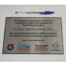 PLACA (15X21 CM) EM METAL PRATEADO, CONTENDO A INSCRIÇÃO 'OS TRABALHADORES METALÚRGICOS DO BRASIL E OS EMPRESÁRIOS DO SETOR NAVAL AGRADECEM AO PRESIDENTE DA REPÚBLICA / SR. LUIZ INÁCIO LULA DA SILVA / PELA RETOMADA DA INDÚSTRIA NAVAL E OFFSHORE NO BRASIL E / PELA CRIAÇÃO DE MILHARES DE EMPREGOS NESSA INDÚSTRIA / NITERÓI, 24 DE JUNHO DE 2010'. ACONDICIONADA EM ESTOJO FORRADO EM TECIDO PRETO.