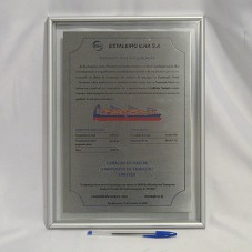 QUADRO (35,5X26 CM) COM MOLDURA EM METAL PRATEADO E TAMPO DE VIDRO. EMOLDURA PLACA(30X21 CM) DE METAL PRATEADO DO LANÇAMENTO DO NAVIO LOG-IN JATOBÁ. NA PLACA, DESENHO DO NAVIO, DIMENSÕES PRINCIPAIS E PORTE BRUTO. ACONDICIONADO EM UM ESTOJO FORRADO EM TECIDO AZUL.