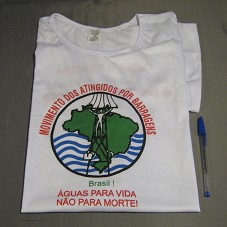 DUAS CAMISETAS IGUAIS (TAM GG) NA COR BRANCA, DE MANGA CURTA. NA FRENTE A MARCA DO 'MOVIMENTO DOS ATINGIDOS POR BARRAGENS' E A INSCRIÇÃO 'BRASIL / ÁGUAS PARA VIDA / NÃO PARA MORTE'. ATRÁS 'ÁGUA E ENERGIA / NÃO SÃO MERCADORIA / É PARA SOBERANIA / DO POVO BRASILEIRO / MOVIMENTO DOS ATINGIDOS POR BARRAGENS'.