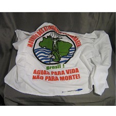 BANDEIRA (76X150 CM) EM TECIDO BRANCO. POSSUI, EM AMBAS AS FACES, A MARCA DO MOVIMENTO DOS ATINGIDOS POR BARRAGENS E A INSCRIÇÃO 'BRASIL! / ÁGUAS PARA VIDA / NÃO PARA MORTE'.