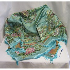 MANTA / TOALHA (142X142 CM) DE FORMATO QUADRADO, CONFECCIONADA EM SEDA AZUL. POSSUI BORDADO PRÓXIMO À BARRA, E AO CENTRO, COM MOTIVOS TÍPICOS DA REGIÃO DA CHINA (FLORES, ANIMAIS, CONSTRUÇÕES). AO REDOR DE TODA A BARRA, FRANJAS AZUIS. ACONDICIONADA EM CAIXA DE PAPELÃO, COM TAMPA AZUL MARINHO.