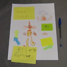 DESENHO (29,7X21 CM) EM PAPEL BRANCO, MOSTRANDO UM BONECO MONTADO COM RECORTES DE PAPEL. POSSUI PAPEIS DE RECADO COLADO, E A INSCRIÇÃO 'PARA LULA / OTTO'. ACONDICIONADO EM ENVELOPE.