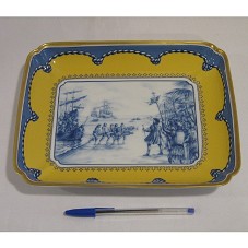 PRATO DECORATIVO (21,5X26 CM) NO FORMATO RETANGULAR NAS CORES AZUL E AMARELO COM CONTORNO DE FIO DE OURO, POSSUI NO FUNDO DESENHO RETRATANDO O DESEMBARQUE DE PEDRO ÁLVARES CABRAL E DOS NAVEGADORES PORTUGUESES EM PORTO SEGURO. ATRÁS A INSCRIÇÃO '500 ANOS / SPAL PORCELANAS PORTUGAL / PEDRO ÁLVARES CABRAL / EDIÇÃO LIMITADA N. NUM. 48'. ACONDICIONADO EM CAIXA DE PAPELÃO PRATEADA.