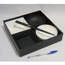 CONJUNTO PARA SUSHI COMPOSTO POR DOIS BOWLS REDONDOS E DOIS BOWLS QUADRADOS NAS CORES PRETO E BRANCO, E DOIS HASHI (TALHARES ORIENTAIS), TODOS CONFECCIONADOS EM RESINA. ACONDICIONADO EM CAIXA DE MESMO MATERIAL (6X24X24 CM) NA COR PRETA.
