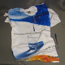 CAMISETA (TAM GG) NA COR BRANCA. POSSUI NA FRENTE ESTAMPA COM UM COPO CONTENDO A LOGOMARCA DA '11ª JORNADA NACIONAL DE LITERATURA', E AS INSCRIÇÕES 'DIVERSIDADE CULTURAL: O DIÁLOGO DAS DIFERENÇAS / 11ª JORNADA NACIONAL DE LITERATURA / ENCONTRO NACIONAL DA ACADEMIA BRASILEIRA DE LETRAS: REVISITANDO OS CLÁSSICOS / 4° SEMINÁRIO INTERNACIONAL DE PESQUISA EM LEITURA E PATRIMÔNIO / SEMINÁRIO NACIONAL DE JORNALISMO CULTURAL'; E AS LOGOMARCAS DOS PROMOTORES, APOIADORES E PATROCINADOR. ATRÁS AS MESMAS INSCRIÇÕES E LOGOMARCAS.