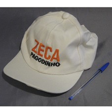 DOIS BONÉS IGUAIS, TEM TECIDO BEGE. NA FRENTE, BORDADO EM LARANJA E PRETO, A INSCRIÇÃO 'ZECA PAGODINHO'.