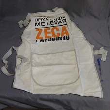 DOIS AVENTAIS IGUAIS, TEM TECIDO BEGE, COM UM BOLSO FRONTAL. NA FRENTE, ESTAMPA, EM LARANJA E PRETO, COM A INSCRIÇÃO 'DEIXA A VIDA ME LEVAR / ZECA PAGODINHO'.