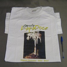 CAMISETA (TAM GG) NA COR BRANCA, DE MANGA CURTA. POSSUI FOTOGRAFIA DA 'GRUTA LAPA DOCE NA CHAPADA DIAMANTINA- BA', ESTAMPADO NA FRENTE.
