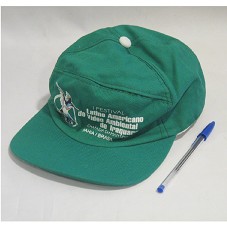 BONÉ EM TECIDO VERDE. POSSUI A INSCRIÇÃO 'I FESTIVAL LATINO AMERICANO DE VÍDEO AMBIENTAL IRAQUARA / CHAPADA DIAMANTINA / BAHIA / BRASIL' E A MARCA DO FESTIVAL.
