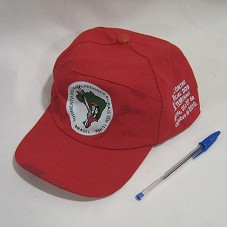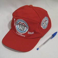 BONÉ EM TECIDO VERMELHO. NA FRENTE, LOGOMARCA DO 'MOVIMENTO DOS TRABALHADORES RURAIS SEM TERRA - BRASIL'. NAS LATERAIS, A INSCRIÇÃO 'COMO FAZER A ESCOLA TRANSFORMANDO A HISTÓRIA' E 'XI ENCONTRO ESTADUAL DOS SEM TERRINHA / RECIFE, 05 A 07 DE OUTUBRO DE 2010'.