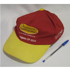 BONÉ EM TECIDO VERMELHO, COM ABA AMARELA. NA FRENTE, A INSCRIÇÃO 'ORÇAMENTO PARTICIPATIVO / O POVO DECIDE / A PREFEITURA FAZ / DELEGADO OP 2010'. NAS LATERAIS, LOGOMARCA DA 'PREFEITURA DO RECIFE / NOSSA CIDADE É A GENTE QUEM FAZ'. NA PARTE INTERNA DO BONÉ, A INSCRIÇÃO MANUSCRITA 'LEMBRANÇA DE MAURILICE / RECIFE-PE'.