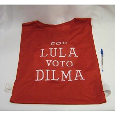 COLETE (TAM G) EM TECIDO VERMELHO. NA FRENTE, BORDADO EM BRANCO, A INSCRIÇÃO 'SOU LULA / VOTO DILMA'. ATRÁS, O NÚMERO '13'.