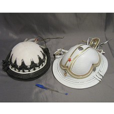 DOIS CHAPÉUS DE COURO, TIPO CANGACEIRO. O PRIMEIRO, NA COR BRANCA, COM DETALHES EM DOURADO E METAL PRATEADO. POSSUI DUAS ESTRELAS VERMELHAS, COM A INSCRIÇÃO 'PT'. O SEGUNDO, BRANCO COM DETALHES EM PRETO E METAL PRATEADO.