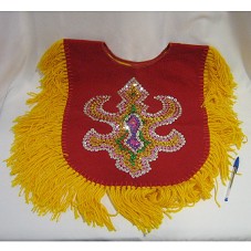 COLETE DE FREVO, CONFECCIONADO EM VELUDO VERMELHO, FORRADO COM TECIDO AMARELO, COM FRANJAS EM LÃ AMARELA. POSSUI FRENTE E COSTAS BORDADAS COM LANTEJOULAS.
