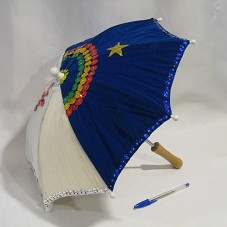 SOMBRINHA DE FREVO, COBERTA COM VELUDO AZUL E BRANCO, E BORDADA COM LANTEJOULAS, FORMANDO A BANDEIRA DO ESTADO DE PERNAMBUCO. POSSUI CABO EM MADEIRA CLARA.