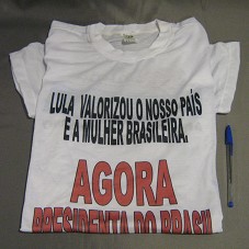 CAMISETA (TAM P) EM MALHA BRANCA, DE MANGA CURTA. NA FRENTE, A INSCRIÇÃO 'LULA VALORIZOU O NOSSO PAÍS E A MULHER BRASILEIRA / AGORA PRESIDENTA DO BRASIL'. ATRÁS, LOGOMARCA DA 'JUVENTUDE PT' E A INSCRIÇÃO 'DILMA PRESIDENTE / VICE MICHEL TEMER / A GALERA VOTA 13 POR MAIS PROJOVEM / APOIO AUTO ESCOLA BITURY / ADEMAR TUR'.