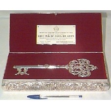 CHAVE DA CIDADE DE LIMA (24 CM) EM PRATA, COM DESENHO DE DUAS AVES AO LADO DE DUAS COLUNAS, COM UMA COROA SOBRE SUAS CABEÇAS. ACOMPANHA PEQUENA CHAVE DA CAIXA QUE A ACONDICIONA. ESTA (13X29X6 CM), EM PRATA TRABALHADA COM DESENHOS DE ARABESCOS E FOLHAS, TENDO NA TAMPA O BRASÃO DA CIDADE DE LIMA. CAIXA FORRADA INTERNAMENTE COM VELUDO VINHO, POSSUINDO UMA PLACA (6X12 CM) FIXADA NO INTERIOR DA TAMPA, COM A INSCRIÇÃO 'MUNICIPALIDAD METROPOLITANA DE LIMA / AL EXCELENTÍSIMO SEÑOR LUIZ INÁCIO LULA DA SILVA / PRESIDENTE DE LA REPÚBLICA FEDERATIVA DEL BRASIL / HUÉSPED ILUSTRE DE LA CIUDAD / AGOSTO DE 2003 / LIMA, PERU. / LUIS CASTAÑEDA LOSSIO / ALCALDE'.