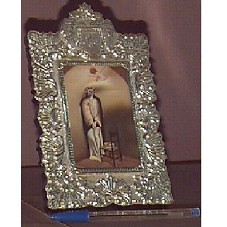 PORTA RETRATO (12,5X21 CM) EM MADEIRA, E PARTE FRONTAL EM PRATA TRABALHADA COM MOTIVOS DIVERSOS, TENDO NA PARTE SUPERIOR, DESENHO DE UM BRASÃO E DUAS ÁGUIAS. NO BRASÃO, DESENHO DE TRÊS COROAS E UMA ESTRELA DE OITO PONTAS. EMOLDURA RÉPLICA DE UMA PINTURA, MOSTRANDO UMA FREIRA COM UMA CADEIRA NA SUA FRENTE; UM ANJO, NA FIGURA DE UMA CRIANÇA, SOBRE UMA NUVEM NA PARTE SUPERIOR. ATRÁS, UMA PLACA COM A INSCRIÇÃO 'RÉPLICA DEL ÓLEO 'SANTA ROSA DE LIMA', DEL PINTOR PERUANO FRANCISCO LASO (1823-1868) / CON LOS ATENTOS SALUDOS / LUIS CASTAÑEDA LOSSIO / ALCALDE METROPOLITANO DE LIMA'. ACONDICIONADO EM CAIXA (23,5X14X5 CM) DE PAPELÃO, COM FUNDO AZUL E DESENHOS DE RAMOS DE FLORES EM AMARELO.