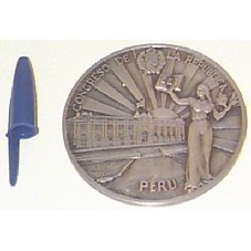 MEDALHA (7 CM) EM PRATA. NA FRENTE, DESENHO DE UMA MULHER SEGURANDO UM LIVRO COM A INSCRIÇÃO 'LEY' EM UMA DAS MÃOS, E RAMOS DE OLIVA, NA OUTRA. AO FUNDO, FACHADA DO PRÉDIO DO CONGRESSO EM PERSPECTIVA, COM UNS RAIOS ATRÁS DELE. TEM A INSCRIÇÃO 'CONGRESO DE LA REPUBLICA / PERU'. ATRÁS, DESENHO DO MAPA DO PAÍS. ACONDICIONADA EM CAIXA (10X10X3,5 CM) FORRADA COM VELUDO AZUL MARINHO.