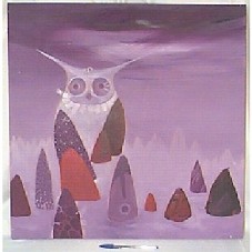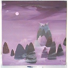 PINTURA ACRÍLICA SOBRE TELA (60X60 CM), EM TONS DE LILÁS E VIOLETA, DE AVES VISIONÁRIAS, CORUJAS, REPRESENTANDO A MAGIA E A MISTICIDADE DE UM CONTINENTE. OS ELEMENTOS EM CONES PONTUDOS, CHAMADOS DE 'LOS CERROS' REPRESENTAM AS DIFERENTES NAÇÕES QUE DEVEM SE UNIR, LEVANDO EM CONTA A PRESENÇA DA MÃE LUA, CRIADORA E PROTETORA DOS HOMENS VISIONÁRIOS. NO CANTO INFERIOR ESQUERDO, ASSINATURA DO AUTOR E ANO. PINTURA EM COMPOSIÇÃO COM OUTRA TELA DE MESMO TAMANHO.