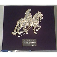 ESCULTURA (17X15X1,5 CM) EM FILIGRANA DE PRATA, COM FIGURA DE UM HOMEM MONTADO À CAVALO. FIXADO EM BASE (28X25 CM) DE PAPELÃO, TIPO PORTA-RETRATO, FORRADA COM VELUDO AZUL MARINHO, E COM PLACA (7X3,5 CM) COLADA NELA, CONTENDO A INSCRIÇÃO 'GOBIERNO REGIONAL PIURA / DR. CÉSAR TRELLES LARA / PRESIDENTE / 25-08-03'. ACONDICIONADA EM CAIXA (29,5X26X4 CM) AZUL MARINHO.