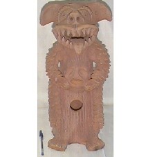 ESCULTURA EM BARRO (46X24X29 CM). FIGURA SEMELHANTE A UM DRAGÃO, COM A BOCA ABERTA E LÍNGUA PARA FORA, BRAÇOS E PERNAS EM ESCAMAS, POSSUINDO CALDA. NAS MÃOS, SEGURA UMA CABEÇA. ATRÁS, A INSCRIÇÃO 'O FOIARA E O CACADOR / CRIACÃO DE JOEL GALDINO'.