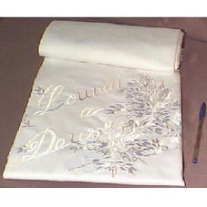 LENÇOL DE CASAL (220X245 CM) NA COR BRANCA. BORDADO NO CENTRO SUPERIOR, EM BRANCO, 'LOUVAR A DEUS', EMOLDURADO POR RAMOS DE ROSAS BORDADOS NA MESMA COR. ACONDICIONADO EM SACO PLÁSTICO, COM INFORMATIVO SOBRE O LENÇOL. EMBALADO EM SACO DE TNT NA COR VINHO, COM ROSAS PINTADAS NA FRENTE.