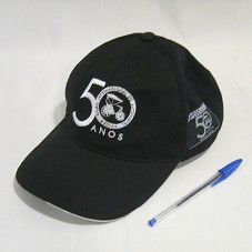 BONÉ EM TECIDO PRETO. NA FRENTE, BORDADO EM BRANCO, O NÚMERO '50', COM DESENHO DE UM CALHAMBEQUE DENTRO DO ZERO, E A INSCRIÇÃO 'SALÃO INTERNACIONAL DO AUTOMÓVEL / 2010 / 50 ANOS'. ATRÁS, A BANDEIRA DO BRASIL. NA LATERAL, SELO DE PRODUTO OFICIAL.