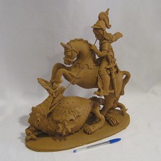 ESCULTURA (35X35X15 CM) CONFECCIONADA EM ARGILA. IMAGEM DE SÃO JORGE MONTADO EM SEU CAVALO, QUE ESTÁ EMPINADO SOBRE O DRAGÃO. NA BASE, DE MESMO MATERIAL, A INSCRIÇÃO 'ELIAS F. DOS SANTOS / DISCÍPULO DE VITALINO'.
