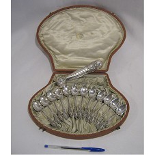 CONJUNTO DE DOZE COLHERES DE CHÁ E UM PEGADOR, CONFECCIONADOS EM PRATA. PEÇA DE ANTIQUÁRIO. ACOMPANHA CARTÃO ASSINADO PELO AGENTE. ACONDICIONADOS EM ESTOJO MARROM.